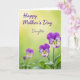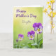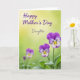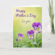 Designed with a soft spring look, this card features a detailed cluster of pansy-like flowers gathered in the lower-right corner, leaning toward each other as if in a gentle embrace ❤️. The velvety petals blend from deep violet into lavender and white, with sunny yellow centers traced by fine dark lines. Crisp green leaves fan out beneath the blooms, adding a fresh, grounded base. Behind them, the background fades from a light buttery yellow at the top into a muted green below, with a softly blurred glow that keeps the focus on the flowers. A smaller out-of-focus bloom and a budding stem sit in the lower-left, like a quiet companion to the main bouquet 🌼. Across the upper area, the words “Happy Mother’s Day” appear in purple flowing lettering, and “Daughter” sits just below in a lighter gray tone. The flowers are positioned low and right, while the text stays higher and more centered, leaving airy space around it against the yellow-to-green backdrop.