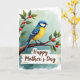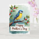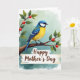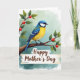 This design shows a small bird as the focal point, its head and back painted in bright blue with a sunny yellow chest that feels like a gentle nod of affection. A thin white ring frames its dark eye, giving it an attentive, tender look, as if it’s quietly keeping someone special company ❤️. The bird perches neatly on a thick, bark-textured branch, and its dark feet curl around the wood with a steady, caring grip. Around the branch, leafy greens spread outward with clusters of glossy red berries that add warm little sparks of color. Behind everything, the background fades into a soft wash of cool greens and teals, like a calm garden airbrushed into the distance. Near the bottom, the words “Happy Mother’s Day” sit beneath the scene in flowing brown lettering, easy to spot without overpowering the artwork 🌼. The leaves show soft shading and rounded edges, and the berry clusters hang in tight groups along the branch.