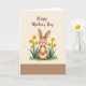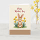 This greeting card features a plump brown-and-white rabbit sitting front and center, looking outward with wide, gentle eyes and a small smile that feels quietly affectionate ❤️. Soft rosy cheeks and rounded features give the character a sweet, friendly presence, as if it’s pausing to share a tender moment with the viewer. The rabbit rests among clusters of golden-yellow flowers that suggest early spring, their slim green stems and pointed leaves curving in close like a welcoming hug. A light grassy patch along the bottom adds texture and a grounded, cozy setting without crowding the scene. The background stays a warm cream wash, letting the rabbit and blossoms stand out with softly blended color transitions. Near the top, a short celebratory message is placed in flowing red lettering, centered above the illustration for easy reading. The overall look is gentle and romantic in its details, like the rabbit’s calm gaze and the way the flowers frame it with care 🌼. The yellow blossoms scatter around the rabbit in small bunches, with green leaves peeking between petals against the creamy backdrop.