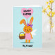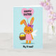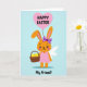This card shows an orange, human-like bunny centered on a light blue background that feels like early spring 🐰. The bunny has rosy cheeks, a bright smile, and long ears with soft pink inner details, and it wears a scalloped pink dress that adds a sweet, friendly touch. A purple bow with white polka dots sits on its head, and small white wings peek out from behind, giving the scene a gentle, caring mood. In one paw, it holds a woven brown basket filled with three yellow, striped egg shapes, as if it’s bringing a small gift to someone special. Above the bunny floats a large pink heart-shaped balloon, suggesting affection in a simple, romantic way 🐇. Dark lettering sits on the balloon, and more dark text is placed below the bunny to complete the holiday message. The lines are smooth and the colors stay soft and pastel, keeping the focus on the bunny, the basket, and the heart balloon against the open blue space. The balloon’s dark text stands out clearly within the pink heart, with the lower line of dark text centered beneath the bunny.