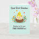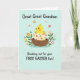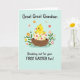 Designed with a sweet springtime scene, this illustration centers on a bright yellow baby bird peeking out of a cracked eggshell, its simple black eyes and small orange beak giving it an affectionate, friendly look 🐣🌷. The little bird sits snugly in a warm brown nest, adding a cozy, cared-for feeling to the moment. Behind it, a pale aqua sky-like background keeps the setting light and airy. Around the edges, stylized flowers in orange, pink, and yellow mingle with fresh green leaves, forming a gentle border that feels like a garden gathered close. The eggshell is decorated with scattered pastel dots in red, green, and pink, adding a lighthearted texture. At the top, the phrase “Great Great Grandson” appears in rounded lettering, set prominently in a darker tone for easy reading. Near the lower area, “Breaking out for your FIRST EASTER fun!” is placed as a second line of text, with “FIRST EASTER” emphasized in all caps. The flowers and leaves frame the centered nest while the dotted eggshell pieces sit around the chick against the soft aqua background 🐰.