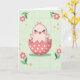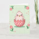 This card shows a sweet digital illustration of a tiny light-pink hatchling smiling from inside a cracked coral egg with white polka dots. Its eyes are closed with long dark lashes, rosy cheeks, and a small bright yellow beak, giving it a tender, friendly look as if it’s greeting someone special 🌷. Little wings peek out on either side, slightly open like a gentle welcome. The background is a soft light green with a faint grid pattern and scattered small blossoms that keep the scene airy and springlike 🐰. Larger stylized pink flowers with deep green leaves sit near the corners, framing the hatchling like a cozy garden border. A short message in a simple dark font sits near the top, standing out clearly against the pale background, while the rest of the space stays uncluttered. A soft shadow beneath the broken shell grounds the character, and the jagged shell edges curve around its round body in warm coral tones. In the corners, the pink flowers have rounded petals and are paired with layered green leaves that angle inward toward the center.