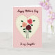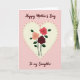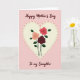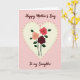 Designed with a soft, romantic look, this card features a large ivory heart centered on a pale pink background, setting a gentle, affectionate tone ❤️. Inside the heart, three roses form a close bouquet, with a coral bloom at the upper right, a peach bloom at the upper left, and a deep burgundy rose nestled below as if they’re leaning in together like close friends. Dark green leaves and thin stems meet near the bottom of the cluster, giving the flowers a united, caring feel. Around the heart, a dotted border is accented with small cream bow-like shapes that add a sweet, celebratory touch 🌼. Near the top of the design, the words “Happy Mother’s Day” appear in warm maroon lettering, centered above the heart. Beneath the heart, “To my Daughter” is placed in matching maroon text, centered and spaced to feel calm and balanced. The pale pink field stays open and airy, while the ivory heart and cream accents keep the focus on the rose colors and the maroon text. The coral and peach roses show simple petal shapes, and the burgundy rose provides the deepest color at the lower center of the bouquet.