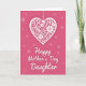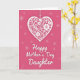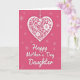 Designed with a romantic, celebratory look, this card features a large white heart hanging in the upper half against a rich fuchsia background ❤️. The heart appears suspended from pearl-like bead strands, with a soft shadow beneath it that adds gentle depth. Inside the heart, swirling botanical details curl into vine-like loops, leafy touches, and layered flowers that feel like a delicate lace pattern. The strong contrast between the bright white heart and the saturated pink backdrop creates a cozy, affectionate mood, like a quiet moment shared between close friends. Below the heart, a flowing line of white lettering stretches across the lower area, standing out clearly against the darker color behind it. Small starburst shapes and faint butterfly silhouettes are sprinkled around the background, adding light movement and a dreamy touch 🌼. The overall scene is framed by the fuchsia field, with the hanging beads near the top and the scattered butterflies fading softly into the pink.