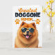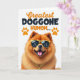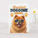 This greeting card features a fluffy dog as the main character, posed with a confident tilt against a bright white background that keeps all attention on its face. The dog’s thick golden-orange fur looks soft and full, and its wide grin with a pink tongue hanging out adds an affectionate, friendly energy ❤️. It wears square yellow sunglasses with dark lenses that show the white initials “JC,” giving the pup a trendy, slightly flirtatious edge. A chunky gold-toned chain necklace rests around its neck, adding a fun, dressed-up touch that feels like it’s ready to charm someone special. Near the top, the message “Greatest DOGGONE HUMOM...” is set in mixed lettering, with “Greatest” in orange and the rest in darker text for contrast. Two small orange paw prints sit alongside the words, like little accents that echo the dog’s warm fur color 🌼. The layout stays open and airy, with the text centered above the dog and the bright accessories standing out against the white space. The sunglasses are a sunny yellow, and the “JC” initials appear in crisp white inside the dark lenses.