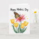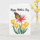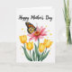 Designed with a bright botanical scene, the card shows a winged insect centered near the top, its wide wings patterned in orange, black, and white as it rests on a pink blossom. The flower’s middle is textured in yellow-orange, drawing the eye like a warm focal point, and the insect’s gentle pose adds a tender, affectionate feel ❤️. Beneath it, a cluster of golden-yellow buds rises on slim green stems, as if leaning toward one another like close friends. Curving green leaves frame the lower area, softening the edges and guiding your gaze upward. Across the white background, small translucent yellow circles and a few tiny dark specks float lightly, adding movement like shared laughter in the air 🌼. A flowing line of message text sits at the top in a dark ink tone, spaced above the main illustration. The pink blossom sits just below the top text, with the yellow buds grouped in the lower center against the white backdrop.