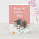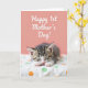 This card shows a sleepy young kitten curled into a small comma shape, inviting the same gentle closeness you’d share with someone you care about ❤️. Soft tabby stripes in warm brown, charcoal gray, and white wrap across its back and tail, and its closed eyes give it a peaceful, trusting look. The kitten rests on a bright white surface dotted with green and tangerine circles, like a cozy blanket laid out for a quiet moment together. The design is split horizontally, with the kitten scene filling the lower half while a muted coral background fills the upper half. Across the coral area, a flowing message sits near the top in a light, creamy color, standing out without feeling loud. The lighting stays soft and even, showing a tiny pink nose, delicate whiskers, and small paw pads that add a tender, affectionate feel 🌼. The overall palette stays warm and calm, balancing the coral sky above with the crisp white and dotted pattern below. In the upper section, the coral field remains smooth and uncluttered while the pale lettering stretches across the top line.