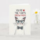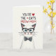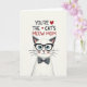 This card features a sweet white cat centered on a soft off-white background, giving the scene a gentle, affectionate feel ❤️. The layout is vertical, with the cat sitting in the lower area and looking straight ahead as if sharing a quiet, friendly moment with the viewer. Its fur is mostly white with light gray tips on the ears and a soft pink inside each ear, adding a tender, cozy touch. Bright blue eyes sit behind dark-rimmed glasses, and the calm, attentive gaze suggests a thoughtful kind of closeness. A dark bow tie with small white polka dots rests under its chin, making the character look neatly dressed and a little date-ready without trying too hard. Near the top, a short message appears in mixed, decorative lettering, with red hearts sprinkled around it 🌼. The cheeks show a faint pink blush, and the red hearts sit near the upper text against the pale background.