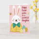 This card shows a cheerful bunny 🐰 set against a soft pink background, with long white ears, lightly blushed cheeks, dot eyes, and a small smile that feels like it’s meant for someone close. The bunny sits on the left side of the layout, angled slightly toward the right as if it’s looking over at the message like a quiet hello between friends. It wears a sunny yellow tunic with small polka dots and a teal bow tie that adds a neat, dressed-up touch. The lighting is gentle and diffused, giving the whole scene a cozy glow without harsh shadows. On the right side, a short greeting appears in a loose, handwritten-style font, placed mid-height and colored in a darker tone that stands out clearly from the pink. Near the bottom, three decorated eggs in mint green, soft pink, and warm yellow show different patterns like stripes, dots, and zigzags, adding a festive Easter note 🌷. Near the top, small butterfly-like shapes float lightly above the bunny’s ears in pale tones.