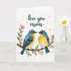 Designed with two stylized birds perched close together in the lower half, the illustration shows them leaning in as their small dark eyes meet in a tender, friendly moment ❤️. Their upper bodies and wings are a rich blue, while their bellies glow a sunny yellow that stands out against the soft, creamy background. They sit on a sturdy green branch that curves beneath them, dotted with pale pink blossoms and a few fresh buds. Above the pair, a flowing line of teal lettering stretches across the upper area, centered and easy to spot. A few tiny pink floral accents are scattered lightly around the background, adding gentle decoration without crowding the scene 🌼. The paint-like texture gives the colors soft edges, as if brushed on with water and light. The birds’ beaks angle toward each other, and the branch is shaded with deeper greens along its underside while the blossoms fade from blush to near-white at the tips.