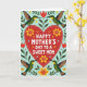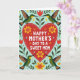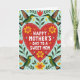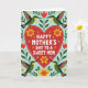 Designed with a folk-art look, this card centers on a large crimson heart that feels like it’s being offered with quiet affection ❤️. White lettering sits across the heart’s middle, standing out clearly against the red, and a neat ring of tiny white dots traces the heart’s edge. Four small, stylized birds frame the heart in a balanced layout, their long beaks angled inward as if they’re sharing a gentle moment together. Their feathers mix emerald green and warm gold, with orange-striped wings that add a friendly spark against the sky-blue background. Around them, a garden scene blooms with yellow daisy shapes 🌼, red tulip-like flowers, and scattered little blue and orange star-like marks. Dark green leaves and curling stems weave through the flowers, linking the birds and the heart into one flowing arrangement. Fine details show up in the feather textures and the tiny star shapes sprinkled between the blossoms.