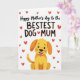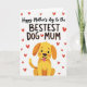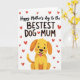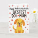 This design shows a golden-yellow cartoon dog sitting along the lower part of the card, with rounded shapes, wide shining eyes, and a pink tongue hanging out as it looks upward with friendly devotion ❤️. Above the dog, a large line of casual, hand-drawn lettering stretches across the top half in deep black, giving the message the most attention. Around the words, small red hearts drift across the white background, scattered in different sizes like little sparks of affection. The simple white space keeps everything airy, while the warm gold and orange tones in the dog feel cozy and companionable. The dog’s upward gaze and open-mouthed grin create a sweet, loyal connection to the message, like it’s directed to someone it adores. The hearts add a gentle romantic touch without crowding the scene, and a few float near the top corners to balance the layout 🌼. The black text sits centered above the character, with the dog anchoring the bottom edge against the bright white backdrop.