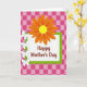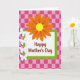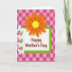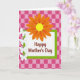 Designed with a cheerful floral scene, this card features a large stylized flower near the top, with orange petals spreading out from a sunny yellow center 🌼. The bloom slightly overlaps a white rectangular panel below it, as if leaning in with a gentle, affectionate closeness ❤️. A thin apple-green border outlines the panel, giving the message area a crisp frame against the busier background. Along the left side of the panel, four small white butterflies rise in a neat vertical line, like they’re floating upward in a soft, friendly dance. Inside the white panel, warm crimson text sits centered and easy to read, standing out clearly against the light space. Behind everything is a checkerboard pattern that alternates blush pink and deeper fuchsia, adding a lively backdrop without crowding the main elements. The lighting looks bright and evenly diffused, making the oranges, greens, and pinks feel fresh and inviting across the whole design. The background shows alternating blush pink and fuchsia squares behind the green-framed white panel and the four white butterflies on its left edge.