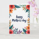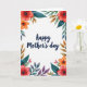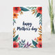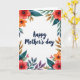 This card features a white background with a soft watercolor garden border that wraps around the edges, creating a gentle frame for a Mother’s Day message ❤️. In the center, deep blue flowing lettering reads “happy Mother’s day,” standing out clearly against the open space. Warm coral and soft orange flowers sit near the corners, their rounded petals and darker centers leaning inward like a caring gesture. Around them, layered leaves in deep teal, forest green, and earthy brown overlap in a cozy, close-knit way that suggests affection and togetherness. Small touches of muted lavender and blush pink are tucked between the greenery, adding a tender, friendly warmth without crowding the design 🌼. The text stays centered and unobstructed while the floral elements remain mostly along the border, guiding the eye back to the message. Light washes and gentle gradients give the plants a translucent look, like fresh spring growth. The border is densest at the corners, with airy white space and scattered leaves along the sides.