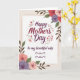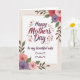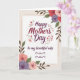 This greeting card centers a framed panel on a white background, with “Happy Mother’s Day” written in flowing maroon lettering and “to my beautiful wife” placed just below in soft purple. A warm beige border surrounds the middle area, giving the message a gentle spotlight without harsh contrast. In the corners, clusters of flowers in muted pink, mauve, and quiet purple lean inward as if they’re gathering around the words ❤️. Slender twigs with tiny buds curl along the edges, adding a natural, affectionate touch that feels like a small bouquet arranged for someone special. The greens are subdued with hints of earthy brown in the leaves and stems, keeping the palette calm and romantic 🌼. The text stays centered and easy to read, with the main line larger and the second line slightly smaller for a tender, intimate emphasis. Soft floral sprays sit at each corner, with small buds and leaves extending toward the inner frame.