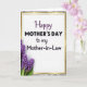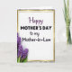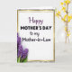 This greeting card features a polished digital layout that feels affectionate and respectful ❤️. Centered on a bright white panel, the message reads “Happy Mother’s Day to my Mother-in-Law,” arranged in stacked lines for easy reading. “Happy” and “to my” appear in a flowing purple cursive-style lettering, while “MOTHER’S DAY” and “Mother-in-Law” are set in strong black sans-serif text that anchors the design. A thin gold line frames the inner white panel, giving the words a gentle spotlight. Around it sits a wider marble-look border in soft white with faint gray veining, edged again by a narrow gold outline for a refined finish. In the bottom-left corner, a cluster of deep purple blossoms and bright green leaves leans inward, like a thoughtful bouquet offered with care 🌼. The flowers show dense purple florets with layered petals, and the marble border has subtle gray streaks running diagonally behind the gold trim.