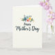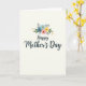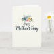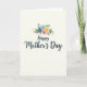On the front of the card, the words “Happy Mother’s Day” sit centered in deep indigo lettering with smooth, flowing strokes, giving the message a tender, affectionate look ❤️. Directly above the text is a small bouquet of stylized flowers that feels like a gentle offering, as if placed there with care. The blooms include soft sky blue, blush pink, and warm marigold yellow, arranged closely so the colors lean into each other like close friends. Around the flowers, broad green leaves add depth, while slimmer gray-blue sprigs cool the palette and keep the cluster airy. A few smaller fronds in muted ochre add a sun-touched accent, like a quiet glow tucked between petals 🌼. The background is creamy off-white with a subtle paper texture, leaving plenty of open space so the bouquet and lettering stand out without crowding. The floral cluster is positioned above the centered greeting, with green leaves fanning outward and tiny ochre fronds peeking between the blue and pink blossoms.