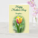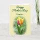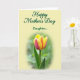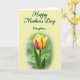 This greeting card features a calm floral scene that feels like a gentle hug between close family members ❤️. In the lower half, a single tulip takes center stage, its yellow petals edged and streaked with deep pink-red tones that suggest tender affection. The flower rises from a softly blurred green garden background, with a slim stem and a small leaf that add a natural, growing touch. Across the upper portion, dark green lettering reads “Happy Mother’s Day Daughter...” and sits neatly against a light cream area. The text is placed high and centered, leaving plenty of open space so the flower below feels cherished and noticed. Soft, diffused light falls across the petals, making the color transitions look smooth and gentle, like a quiet moment shared between loved ones 🌼. The background stays creamy and bright while the tulip’s yellow-and-rose edges stand out sharply against the green blur.