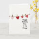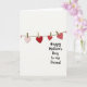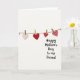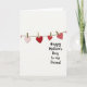 Designed with a bright white background, the card features a string of heart shapes hanging across the upper area like a sweet decoration between close friends ❤️. A thin piece of twine stretches from left to right, held by tiny wooden pins that add a cozy, homey touch. The hearts mix deep red and white tones, and their patterns vary to suggest different personalities coming together—one solid red, one dotted, and one with angled stripes. Soft lighting creates gentle shadows under each heart, making them look like they’re lightly swaying in place. Midway down and slightly to the right, the message “Happy Mother’s Day to my Friend” is printed in dark, flowing lettering that stands out clearly against the pale background. The open space around the words keeps the layout airy, while the hearts above feel like a small, affectionate gesture shared between pals 🌼. At the top edge, three patterned hearts hang from twine with tiny wooden pegs, casting faint shadows on the white surface.