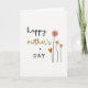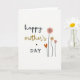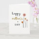 This card features a white background with a vertical stack of words that feels like a gentle note to someone you love ❤️. “Happy” sits at the top in flowing black lettering, followed by “Mother’s” just below in a golden-brown, cursive-style look that adds warmth. A small black asterisk appears next as a quiet pause, and then “DAY” lands underneath in simple black lettering that feels steady and modern. To the right of the text, three stylized flowers rise on thin black stems, leaning slightly like they’re reaching toward the message in a friendly, caring way 🌼. The tallest flower is rosy pink, a second bloom is a soft peach, and a smaller flower in bright pink finishes the trio, each with rounded petals and a dark center. Tucked near the stems is an orange, heart-shaped leaf that adds a tender touch without crowding the layout. The flowers cluster along the right edge while the text stays centered-left, leaving plenty of open space around the black stems and the pink and peach petals.