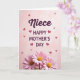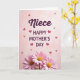 This card features a tender layout on a blush-pink background that feels soft and affectionate, like a gentle hug between close family. Near the top, the word “Niece” appears in a flowing deep plum style, drawing the eye first. Just below it, “Happy Mother’s Day” is set in uppercase letters in a darker tone, standing out clearly against the pale backdrop. Tiny crimson heart shapes ❤️ sit around the line of text, like little affectionate notes sprinkled nearby. More faint, slightly blurred hearts drift across the background, adding depth and a quiet sense of closeness. Along the bottom third, three large daisy-like flowers bloom with soft pink petals and warm yellow centers, giving the scene a friendly, caring feel 🌼. Gentle lighting makes the petals look velvety, and the pink gradient behind them stays smooth and airy. The blossoms are clustered together at the lower edge, with the yellow centers facing forward beneath the text.