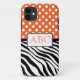 Stylish iPhone 5 Casemate Barely There Case designed with white polka dots over orange on the top, black & white zebra print on the bottom, and personalized with your initials in the middle.