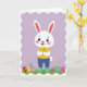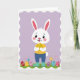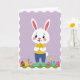 This card shows an illustrated white bunny character 🐰 centered on a soft lavender background, with large black eyes, rosy cheeks, and a little tongue peeking out as if sharing a sweet secret with a friend. It wears a sunny yellow top, blue trousers, and teal boots, and its gentle, careful grip around a golden, polka-dotted egg reads like an affectionate offering. Along the bottom, a green strip of grass sets the scene, scattered with colorful eggs decorated in stripes, zigzags, and speckles in reds, yellows, pinks, and blues. Tiny flower shapes and small starburst accents are sprinkled across the grass, adding a springtime touch 🌷. A short greeting line sits near the top in a simple, easy-to-read style, set in a darker tone that stands out against the lavender. The layout feels balanced and friendly, with the bunny’s forward-facing pose and soft expression inviting a warm connection. A wavy white border frames the whole design, like a scalloped edge around the lavender sky.