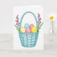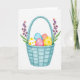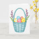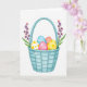 Designed with a pale aqua woven basket at the center, this Easter card shows a gentle spring scene that feels like a sweet note between close friends 🌷. Inside the basket sit five decorated eggs nestled in soft green grass, arranged like a shared little treasure. One egg is sky-blue with small white dots, another is rose-pink with matching dots, and a sunny yellow egg has larger yellow spots that add a light, cheerful contrast. A creamy white egg is speckled, while a warm coral egg stays solid, giving the group a calm balance that reads like an affectionate pairing. Two slim flowering sprigs stand on either side, their green leaves and tiny purple and orange blossoms leaning inward as if they’re framing the basket with a tender embrace 🐰. The greeting text is placed near the top in a soft pastel tone, with a smaller line near the bottom in a lighter shade that doesn’t overpower the artwork. Gentle watercolor shading and highlights define the basket’s weave against a bright white background, with the blossoms’ small clustered petals clearly visible.
