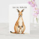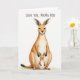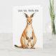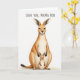 This card shows two gentle marsupials sharing a close, caring moment on a bright white background ❤️. A tall adult stands upright in the foreground with long ears and strong hind legs, leaning slightly as if guarding the little one. Tucked snugly in the adult’s pouch, the smaller youngster looks outward with shiny dark eyes, echoing the parent’s alert posture in a sweet, trusting way. The animals are painted in soft, watercolor-like washes of warm ochre and sienna, with creamy undersides and darker touches on the ears, nose, and paws. Their faces and body angles suggest quiet affection, like a calm embrace held in stillness. Near the top, a hand-drawn line of text sits above the pair in a dark ink tone, giving the design a gentle focal point 🌼. Subtle shading around their outlines adds depth while keeping the background open and uncluttered, and the adult’s ears are tipped in a deeper brown.