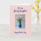 This card features a soft pastel pink background that feels gentle and affectionate, like a quiet note shared between close friends ❤️. Near the top and along the sides, flowing blue lettering frames the design, with the main message placed above the central image in the same rich blue. In the center sits a rectangular photo insert that draws the eye like a keepsake tucked into a letter. The photo shows a glossy blue ceramic vase holding a close bouquet of cup-shaped flowers, their ruffled petals mixing soft pink and crisp white, with a few subtle stripes that suggest a sweet, romantic attention to detail 🌼. Fresh green stems and leaves peek out around the blooms, adding a natural contrast that makes the arrangement feel alive and freshly gathered. Behind the flowers, a muted gray backdrop and diffused light create a calm setting that lets the colors stand out without feeling loud. The blue text appears in smooth, flowing strokes around the photo, and the vase’s bright sheen catches the light against the soft, velvety-looking petals. The rectangular photo sits centered on the pink field, with the blue vase near the lower middle and the blossoms spreading upward toward the top edge.