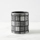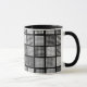 Coffee/drinks mug with stylish polka dot patchwork pattern in gray, black and white.