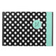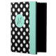Stylish iPad Air 2 folio style case with built in stand done in a black and white polka dot. A mint green band, running down the right front edge and a decorative mint green disc, on the middle front, has a black one letter monogram ready to personalize. Makes a great personalized gift idea.