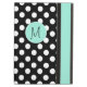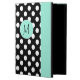 Stylish iPad Air folio style case with built in stand done in a black and white polka dot. A mint green band, running down the right front edge and a decorative mint green disc, on the middle front, has a black one letter monogram ready to personalize. Makes a great personalized gift idea.