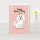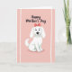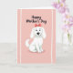 This greeting card features a vertical layout with a soft pink background that sets a gentle, affectionate mood ❤️. In the lower half, an adorable white cartoon dog sits upright, its rounded shape lightly shaded to look plush and cozy, as if waiting to be hugged. The dog’s small black eyes and curved smile suggest a friendly, caring presence, like a companion sharing a quiet moment. A reddish-pink bow rests on its head, adding a sweet touch that feels like a thoughtful nod to someone special. Near the top, the words “Happy Mother’s Day” appear in dark, flowing lettering, centered and easy to read against the pale backdrop. Two narrow off-white bands run vertically along the left and right edges, giving the design a softly framed look 🌼. The bow’s warm pink-red tone stands out crisply against the dog’s white fur and the blush background.