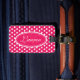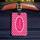 Modern girls bright red pink polka dot patterned graphic luggage tag. Perfect for holidays and trips. Add your name and initial to front of tag and customize the reverse of this tag with your name and address details. Designed exclusively by Sarah Trett.