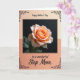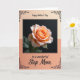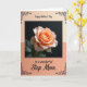 This card features a single rose as the centerpiece, with petals shaded in soft peach and apricot that deepen toward a warm center, like a quiet blush shared between close hearts ❤️. Gentle highlights trace the petal edges, giving them a slightly translucent look and a velvety texture against a deep black background. A small hint of emerald-green leaves appears from the shadowed lower area, keeping the flower grounded and natural. The rose image sits inside a thin black rectangular border, set within a larger layout that fades from pale cream at the top to coral-peach at the bottom. Near the top, a short line of decorative lettering appears in black, centered on the light cream area. Near the bottom, a second line of matching black lettering is centered over the coral-peach area, with delicate flourishes that feel affectionate and calm 🌼. Fine black scrollwork curls into the corners around the outer design, and the overall border remains crisp and dark.