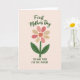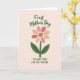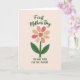 Designed with a softly stylized flower as the main focus, this card centers on a coral-colored round flower middle surrounded by rounded petals that feel like little keepsakes of affection ❤️. Each petal carries a different simple pattern—tiny dots, gentle stripes, or solid shapes—in muted pinks, creamy off-whites, and warm golden tones, like a friendly patchwork gathered close. A deep green stem and two broad leaves anchor the bloom, giving the scene a calm, grounded look. The background is a pale peach wash that keeps everything light and tender, as if the flower is being admired with a caring gaze. Near the top, the words “First Mother’s Day” appear in olive-green lettering, placed above the flower and slightly curved in feel. Beneath the stem, “YOU WERE MADE FOR THIS MOMENT” is set in a straightforward olive-green type style, spaced evenly across the lower area, with a small 🌼 accent nearby. The petals show alternating dot clusters and stripe bands, with one petal left mostly solid in a soft cream tone.