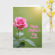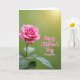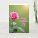This card shows a single rich pink flower filling the left side of a tall design, its layered petals opening like a gentle embrace ❤️. The bloom is sharply detailed, with a darker, textured center and soft outer petals that look velvety to the touch. Behind it, the background fades into a smooth green blur that shifts from light lime to deeper olive, like a quiet garden where someone waits nearby. A warm golden light spills in from the upper right, giving the scene the tender glow of late-day sunlight and a cozy, close feeling 🌼. Near the lower left, a few leaves peek out with visible veins and fine, serrated edges, adding a grounded, natural contrast to the soft petals. In the open green space to the right, the message “Happy Mother’s Day Daughter” sits clearly, outlined in white and filled with bright pink to match the flower. The letters curve gently across the right-center area, floating over the greenery with the sunlit glow fading behind them.