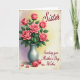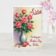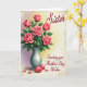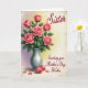 This card features a lush bouquet of pink roses centered high on the front, with petals shifting from deep coral to soft blush for a tender, romantic look ❤️. Glossy green leaves fill in around the blooms, and the arrangement sits in a smooth silver-gray vase that anchors the scene. Soft lighting gives the flowers a gentle glow, like a quiet moment shared between close friends. The background fades from pale lavender on the left to warm, sunlit yellow on the right, creating a calm, dreamy setting 🌼. A faint, textured border frames the artwork with an aged-paper feel. Near the lower area, delicate lettering appears in a flowing style, set lightly over the background in a muted gray tone. At the base of the vase, two closed rosebuds rest beside a few scattered petals.