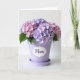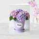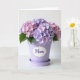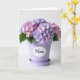 This card shows a potted flowering plant centered on an off-white background, with rounded clusters of small four-petaled blooms filling the upper part of the design. The blossoms mix soft pastel pink and gentle lavender tones, and little touches of green leaves peek out underneath like they’re leaning in close. The plant sits in a smooth, matte lavender cylinder pot with a matching shallow saucer, giving the scene a calm, cozy look. On the front of the pot, a white label with scalloped edges adds a sweet, caring touch, like a quiet note between close friends ❤️. The message is placed on that label in flowing purple lettering, standing out clearly against the white shape. Soft, diffused lighting keeps shadows minimal and highlights the petal texture and the pot’s satin-like finish, creating a tender, affectionate mood 🌼. The label sits centered on the pot, and the purple text is the darkest accent in the whole design. Above it, the bloom cluster forms a rounded canopy of pink and lavender flowers with tiny pale centers.