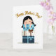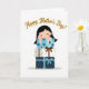 Designed with a tall, centered layout, the front shows a stylized animated person with smooth dark hair and a calm smile, eyes softly closed as they peek from behind three stacked gifts. The white background keeps the focus on the figure and the packages, and the gentle pose suggests a quiet closeness, like sharing a private moment with someone special ❤️. Their small hands rest on the top present, as if hugging the stack and holding the celebration close. The top gift is a light sky-blue box patterned with darker floral shapes, adding a soft, friendly touch. The middle package is off-white with golden polka dots, tied with a rich brown ribbon that adds warmth and a cozy, affectionate feel. The bottom box is deep indigo with small white circles and a light blue bow, grounding the stack with a calm, night-sky look. Curving above the gifts, a line of golden lettering arches across the upper area, while the boxes show floral motifs, polka dots, and dotted patterns in blue, gold, brown, and white 🌼.