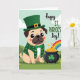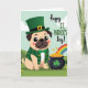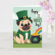 This card shows a sweet fawn-colored pug sitting on a rich green hillside, dressed up in an emerald leprechaun top hat with a gold buckle, a green polka-dot vest, and a matching bow tie. Its big black eyes meet yours with a gentle, friendly look, and a touch of rosy blush on its cheeks adds a cozy, affectionate feel 💚. Behind the pug, a light mint sky stretches out with soft white clouds drifting by. Off to the right, a rainbow 🌈 curves down toward a black pot filled with gold coins that tumble onto the grass. A green shamrock emblem sits on the front of the pot, tying the scene to St. Patrick’s Day. The greeting “Happy St. Patrick’s Day!” is set in large lettering across the upper area of the design in green, standing out against the pale sky. The coins gleam in warm gold tones as they spill beside the pot at the end of the rainbow.