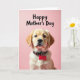 This greeting card features a young golden puppy shown from the chest up, centered on a soft pink background that feels gentle and sweet ❤️. The puppy looks straight at the viewer with big dark eyes, as if offering a quiet, friendly hello that feels like a shared moment. Soft, diffused lighting highlights the fluffy cream-and-golden fur, giving the coat a tender glow and an almost cuddly texture. Around its neck is a dark collar dotted with small white and red circles, suggesting someone cared enough to dress it up for the occasion. A red, bone-shaped tag hangs from the collar, adding a little pop of color like a tiny gift accent. Near the top, a short message appears in black, flowing lettering, placed above the puppy’s head so the words hover like a gentle thought. The overall layout keeps the focus on the puppy’s affectionate gaze while the simple background leaves plenty of breathing room 🌼. The red tag sits slightly off-center below the chin, standing out against the pale fur and pink backdrop.