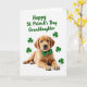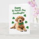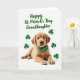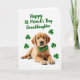 This greeting card features a golden retriever puppy sitting low and centered on a bright white background, its warm honey-colored fur softly lit so it looks extra cuddly and inviting. An emerald green bow tie with small white polka dots sits neatly at its neck, like it’s dressed up to charm someone it adores 💚. The puppy’s clear blue eyes and gentle, slightly tilted expression give it the kind of sweet look you’d share with a favorite granddaughter or a close friend. Around the pup, four bright green shamrocks are scattered with airy spacing, adding a festive touch without crowding the scene ☘️. Across the upper area, the message “Happy St. Patrick’s Day Granddaughter” is written in green lettering, standing out crisply against the white space. The layout leaves plenty of open room between the top text and the puppy, so your eyes travel naturally from the greeting down to that tender face. It’s a simple, affectionate setup that feels like a quiet little moment of connection, framed by shamrocks and soft light, and it’s a friendly way to share St. Patrick’s Day sentiments. The top line sits high in green above the puppy, with shamrocks floating around the center and sides on the white field.