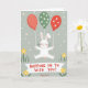 This card shows a stylized white rabbit floating in a tall layout, lifted by three balloons as if on a sweet springtime adventure 🐰. One balloon is deep forest green with white polka dots, and the other two are reddish-orange, with one dotted and the other decorated with small white ovals and thin blue stripes. The rabbit has round black eyes, a tiny pink nose, and rosy cheeks, and its forward-leaning posture gives it the look of reaching toward someone it cares about. Its long ears point up while its paws hold the balloon strings, adding a gentle, affectionate energy to the scene 🐇. Near the lower middle, a white banner stretches across with a seasonal greeting written in red lettering, centered and easy to spot. The background is soft sage green with scattered white specks and small pink blossoms drifting around like petals on a light breeze. Along the bottom edge, yellow star-shaped flowers with bright white centers and green stems form a neat border beneath the banner.