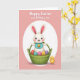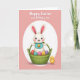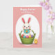 On the front of the card a plump white bunny 🐰 with long ears and soft pink inner fur leans out of a green woven basket, smiling as its paws rest on the rim like it’s greeting a friend. The bunny wears a teal polka-dot bib with a golden oval at the center, giving the outfit a sweet, dressed-up look. Inside the basket, glossy egg-shaped decorations in red, blue, pink, yellow, and lavender sit among bright green grass, adding a festive spring feel. Near the lower right, a tiny fluffy yellow chick stands close by with little wings slightly open, as if sharing the moment with the bunny 🐇. The background is pastel pink, and the main scene is framed within a large white oval that softly draws your eyes inward. Across the top, the message “Happy Easter and Birthday too” is placed in a darker contrasting tone so it stands out clearly against the light backdrop. Subtle shading under the basket and characters gives gentle depth, and the white oval frame has smooth edges against the pink field.