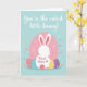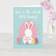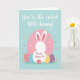 The front design shows a stylized white rabbit seen from behind, softly outlined against a pastel pink oval on a light blue background that feels like a calm spring sky 🐇. Its long ears have coral-pink inner panels dotted with tiny white spots, and the rounded tail repeats the same dotted detail. Near the bottom, four egg-shaped decorations in coral, sky blue, sunny yellow, and lavender sit together like a supportive little cluster beneath the rabbit, hinting at closeness and care. Small heart shapes sprinkled around in pale pink, blue, yellow, and white add a gentle, affectionate flutter to the scene 🌷. Across the top, a flowing white line of lettering stretches from left to right, standing out clearly against the blue. On the rabbit’s back, a short message in red sits neatly centered, finished with a tiny red heart beside it. The polka dots on the ears and eggs are evenly spaced, and the pastel hearts appear scattered lightly across the background.