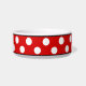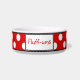 Stylish ceramic cat bowl designed with a big white polka dot pattern over red and personalized with your pet's name.