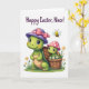 This greeting card features two cute, stylized reptile friends sharing a gentle, close moment in a spring setting 🌷. The larger character stands beside a rustic woven basket, smiling softly with bright, expressive eyes that seem to linger fondly on the smaller companion. It wears a lilac sunhat topped with a pink bow dotted in white, adding a sweet touch against the white background. The smaller character peeks out from the basket as if leaning in for company, wearing a blush-pink polka-dot hat that mirrors the other’s. Around the basket, green grass and white daisies spill outward, and a striped winged insect hovers above with translucent wings for a light, airy feel 🐰. Near the top, a short celebratory message is placed above the characters in a soft pastel tone that stands out clearly against the open space. The basket’s brown weave is carefully detailed, with little blades of grass and daisy petals drawn in crisp, tidy strokes.