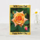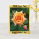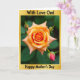 This card features a fully open rose centered on the front, its petals curling in a gentle spiral that feels like an affectionate embrace ❤️. Warm color shifts move from a sunlit orange near the middle to soft peach along the outer edges, giving the bloom a tender, romantic glow. Nearby, a few small rosebuds sit close to the main flower like quiet companions, suggesting closeness and growing affection. One bud shows a deeper red tip that adds contrast and draws the eye without stealing the spotlight. Behind the flowers, deep green leaves fade into a smooth, out-of-focus background, keeping the scene calm and intimate 🌼. A thin golden border frames the artwork and adds a celebratory touch around the edges. Short message text appears near the top in gold, with a second line set near the bottom in a smaller gold font. The rose sits slightly above center, with the buds clustered to one side against the dark green blur.